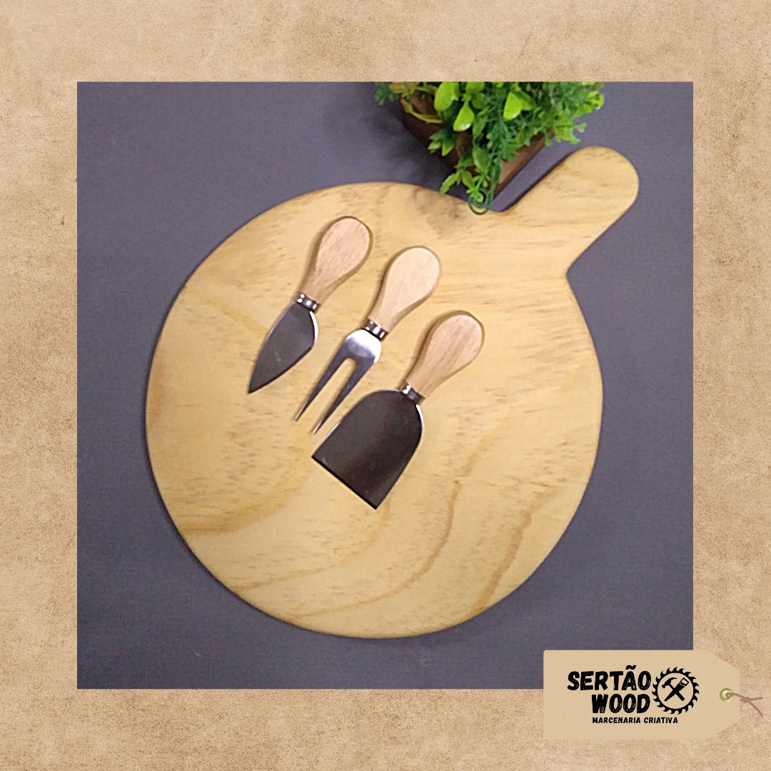 Tábua redonda com cabo em madeira pinus e Facas de Queijo. Dimensões 28x32cm.